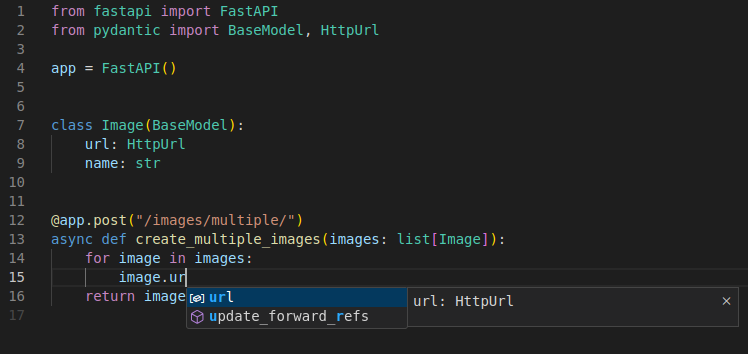 For example, as in the Image model we have a url field, we can declare it to be an instance of Pydantic's HttpUrl instead of a str: